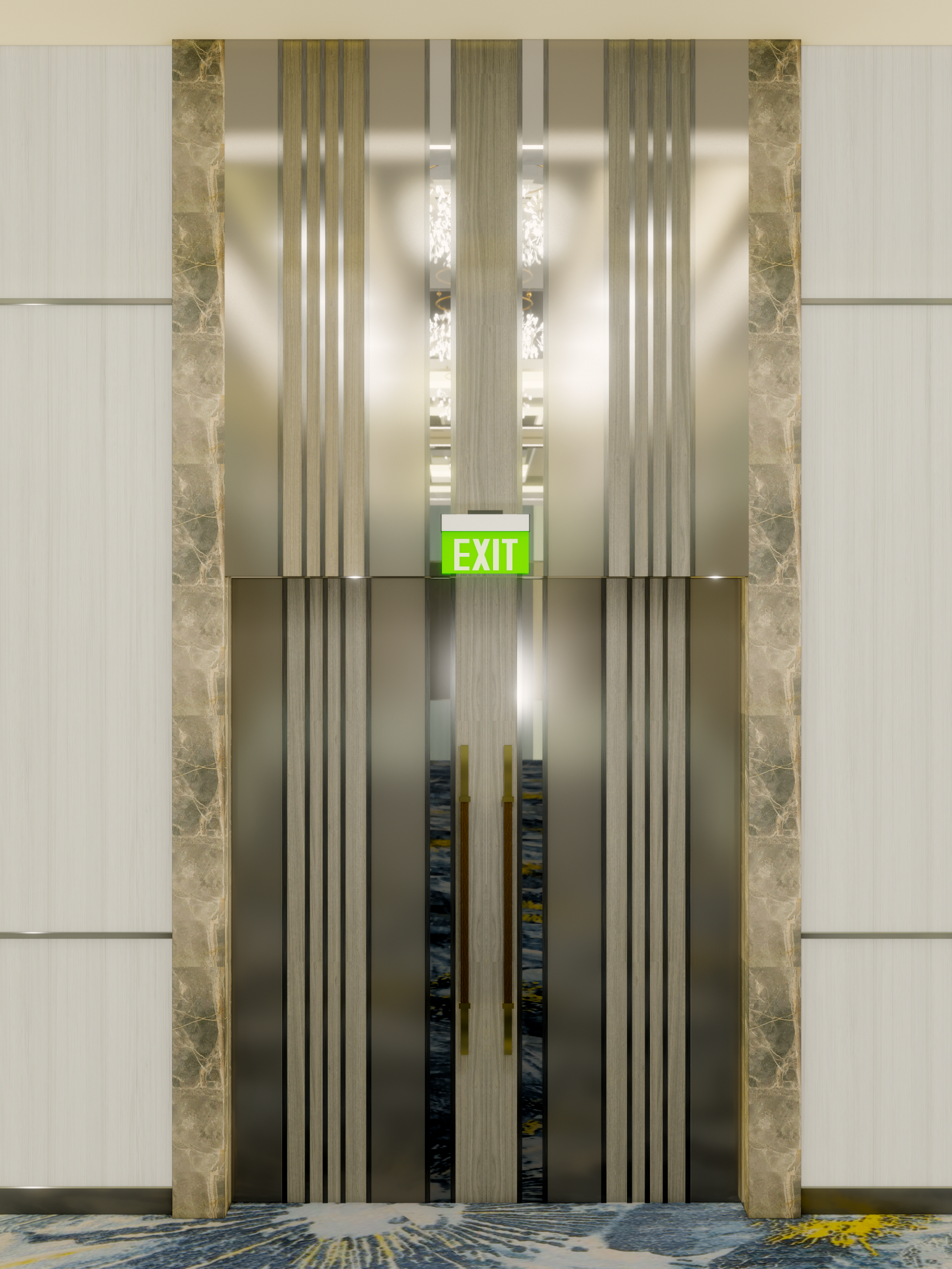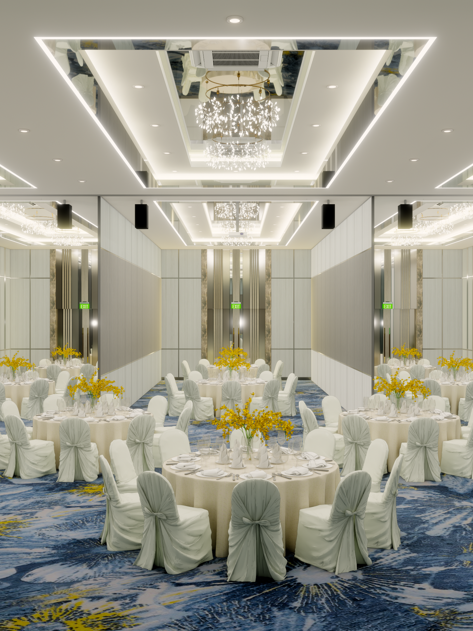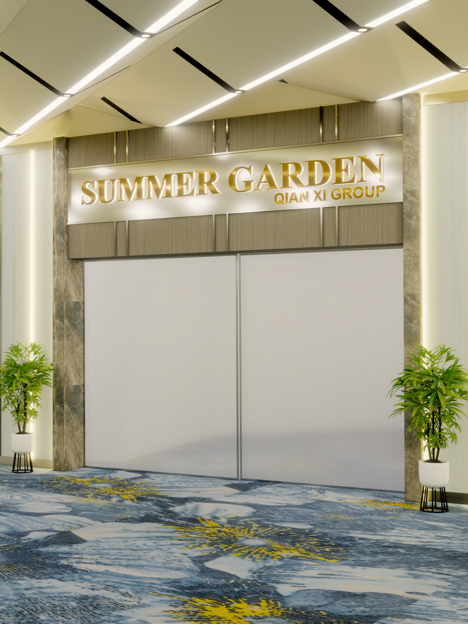 The renovation aims to modernize and elevate the function room into an elegant and refined space. The upgrade includes a refreshed ceiling, new wall panels, and a redesigned main entryway featuring laminated finishes and enhanced lighting. Overall, the renovation focuses on delivering a timeless yet modern ambiance, creating a classic interior look for a sophisticated function hall experience.